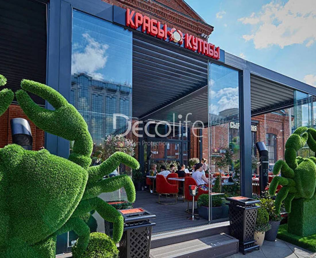 Пергола Decolife Bioclimatic B400 + Раздвижное остекление S100 - г. Москва, ресторан "Крабы Кутабы", Депо