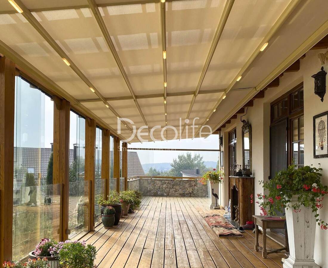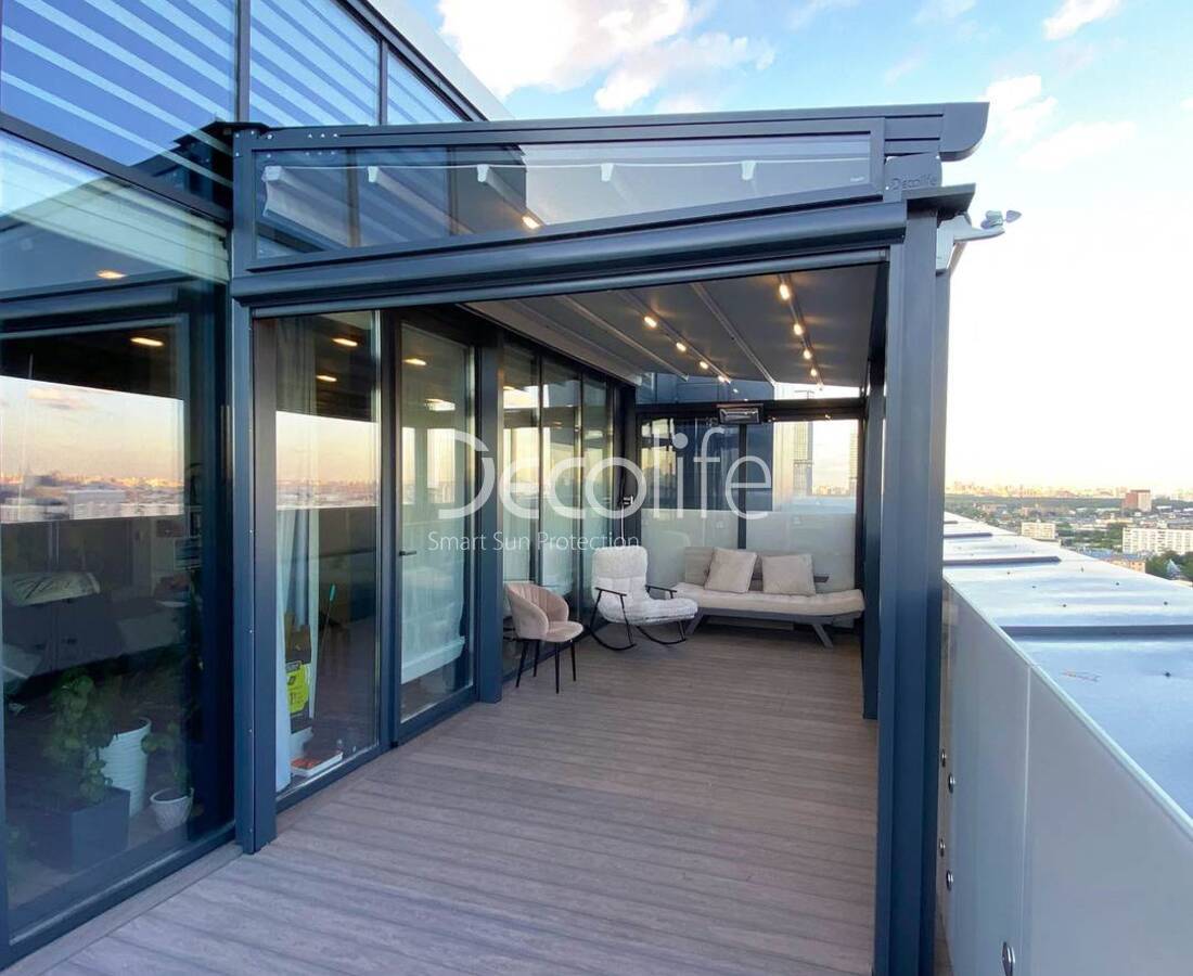 Пергола тентовая Decolife Basic&Pro New + Гильотинное остекление W500 + вертикальная система ZIP 100 - реализовано партнером "ООО Люкс Террас" - Московская обл.