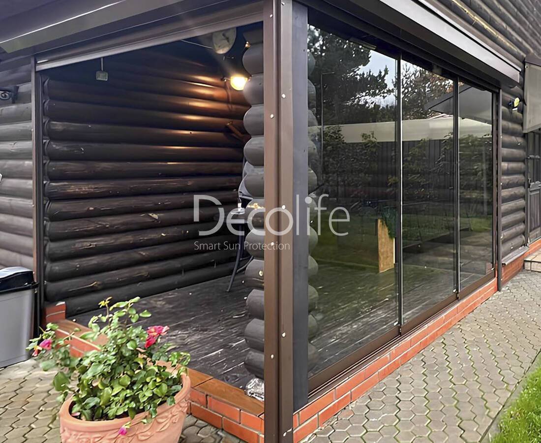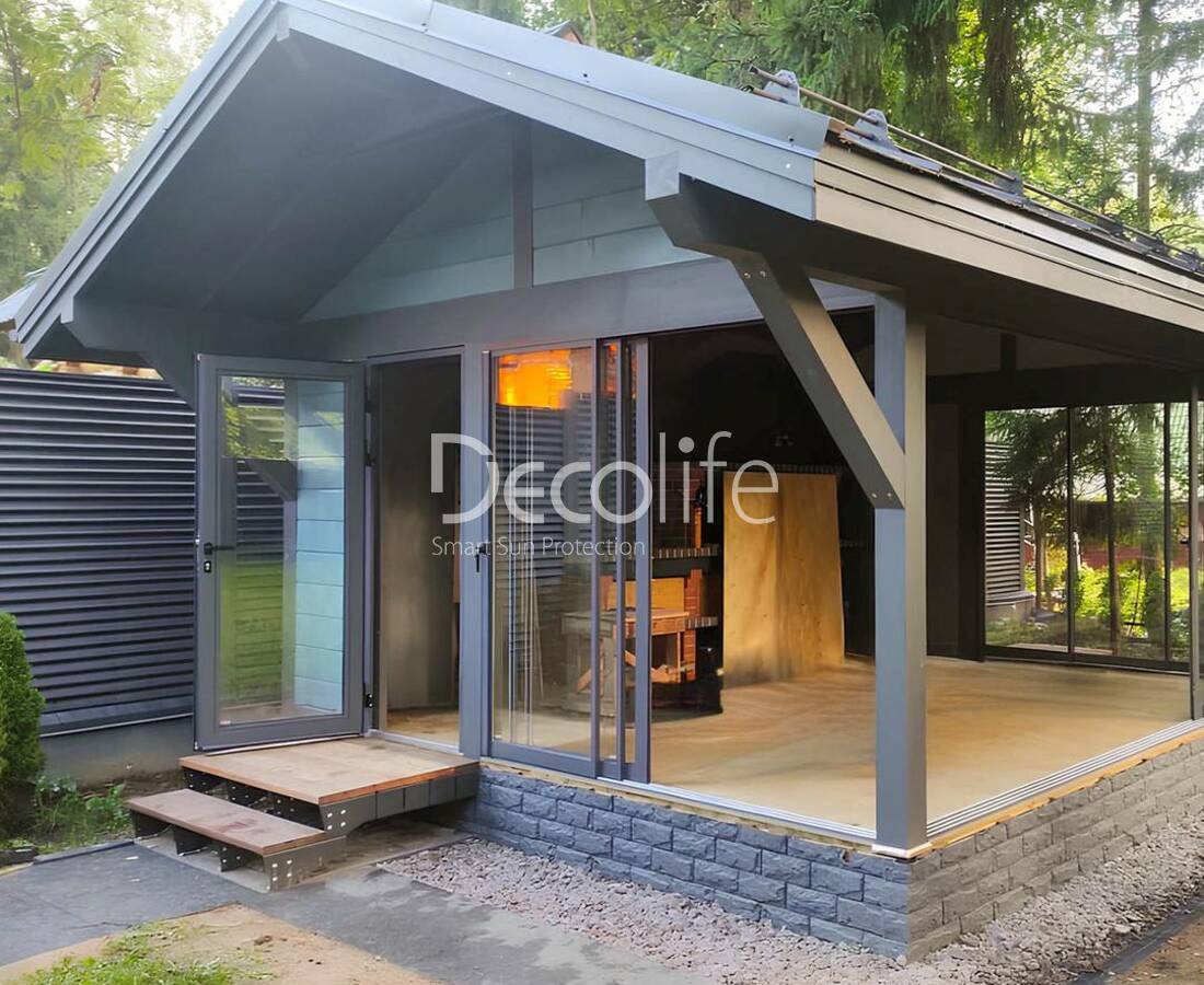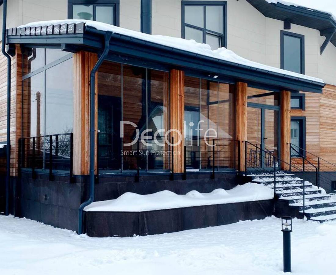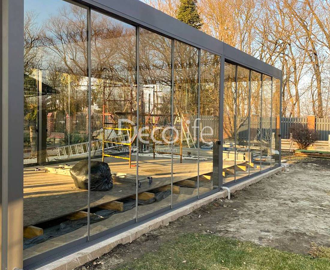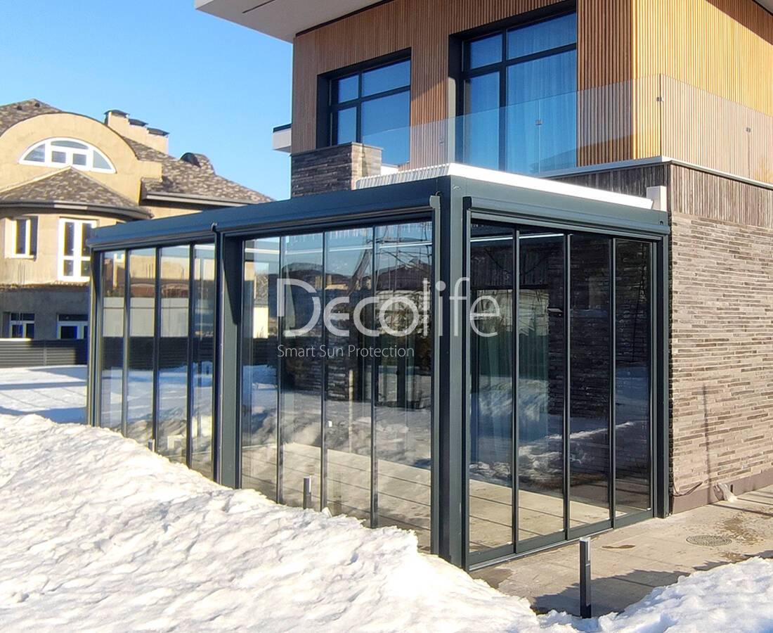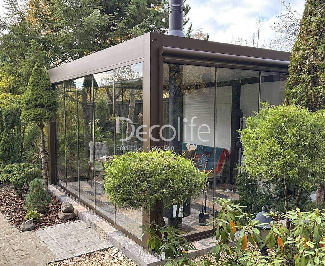 Пергола биоклиматическая Decolife В700-20C + Раздвижное остекление S500 + Вертикальная система Zip 100 - г. Истра